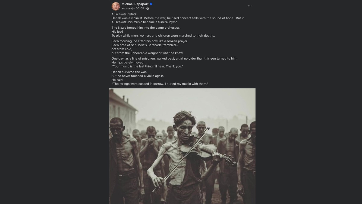 The image shows a bunch of concentration camp prisoners walking together. One of those prisoners is playing a violin. While the image, found by TMZ, looks pretty real, it’s overall obviously fake because the violin playing seems out of nowhere.
