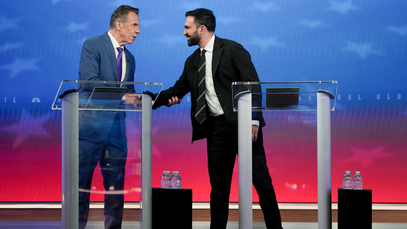 Candidates Andrew Cuomo (left) and Zohran Mamdani shake hands during a mayoral debate in New York on Oct. 16.